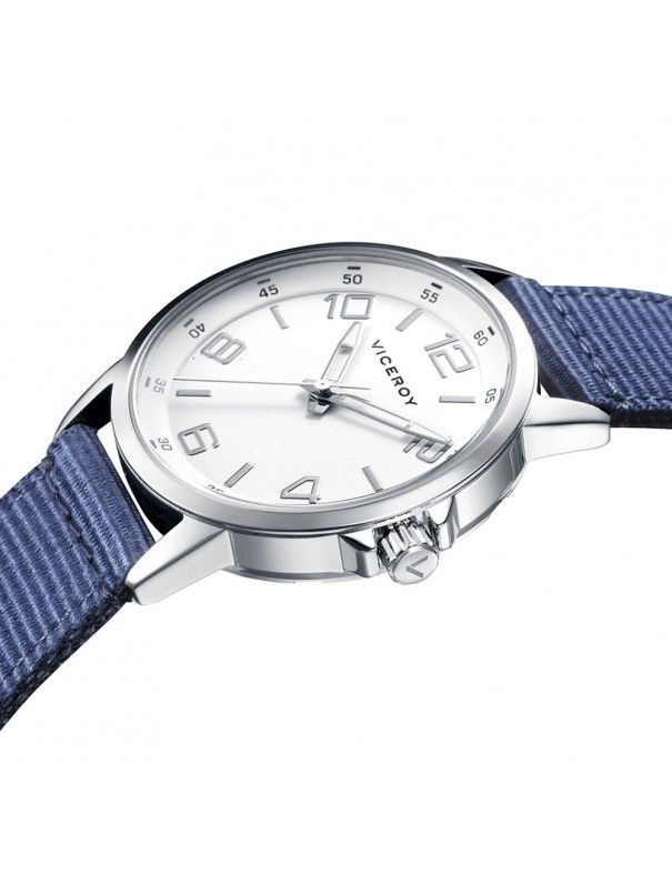 Pack Reloj+Altavoz Viceroy niño comunión 401093-05. Es un reloj analógico con movimiento de cuarzo. La caja es de acero. La esfera es de color blanco con un diámetro de 38 milímetros protegida con un cristal mineral. La correa es de nylon resistente de color azul y piel marrón en zona de hebilla. Funciona con pila y es sumergible a 50 metros de profundidad a 5 ATM. Viene en un pack especial comunión con un altavoz Bluetooth de regalo. Somos distribuidores oficiales de los relojes Viceroy que ofrecen una garantía de 2 años contra cualquier defecto de fabricación. Todos nuestro pedidos se envían con envoltorio de regalo.