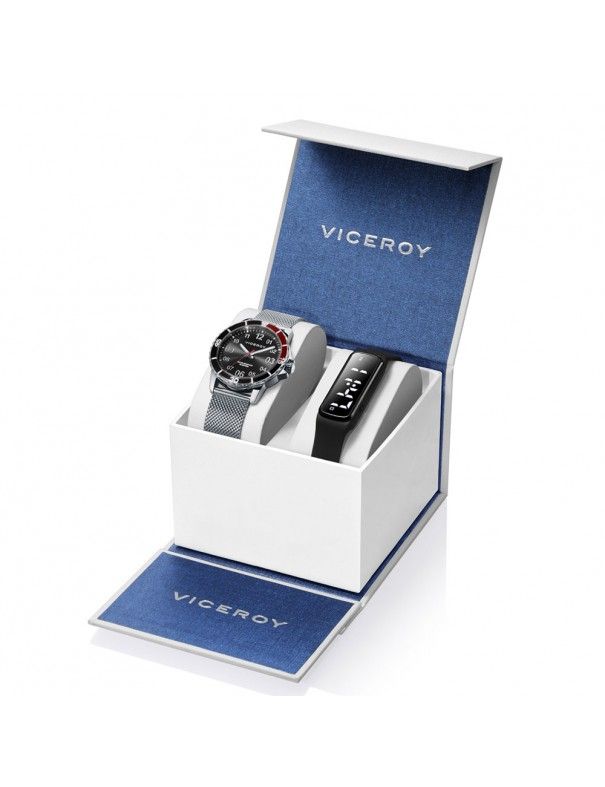 Pack Reloj Viceroy Niño + Pulsera Actividad 401231-55, analógico de tres agujas. Esfera de 38mm de diámetro. Pulsera milanesa de acero y cristal mineral. Bisel en color negro y rojo. Maquinaria de cuarzo. 3ATM, por lo que sólo soporta pequeñas salpicaduras. Pulsera de actividad de regalo.