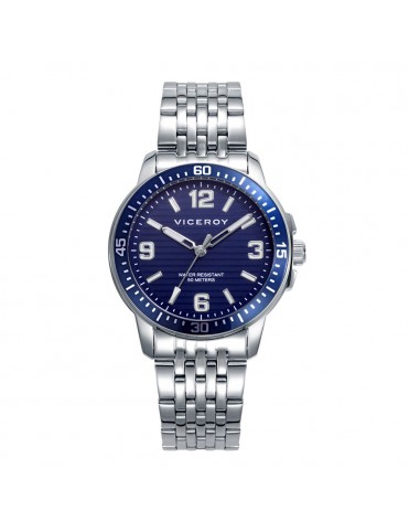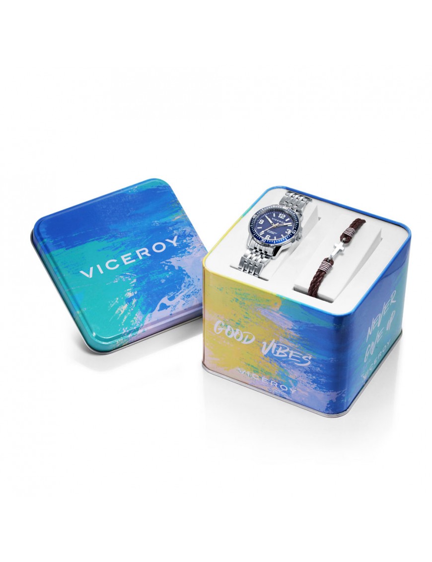 Pack Reloj Viceroy Niño Y Pulsera 401259-35, analógico de tres agujas. Caja y pulsera de acero. Caja de 36mm de diámetro. Bisel decorado en color azul. Agujas e indicadores luminiscentes. Cristal mineral. Sumergible a 5ATM, por lo que es apto para ducha y baño sin inmersión. Acompañado de pulsera de piel con cruz en acero.