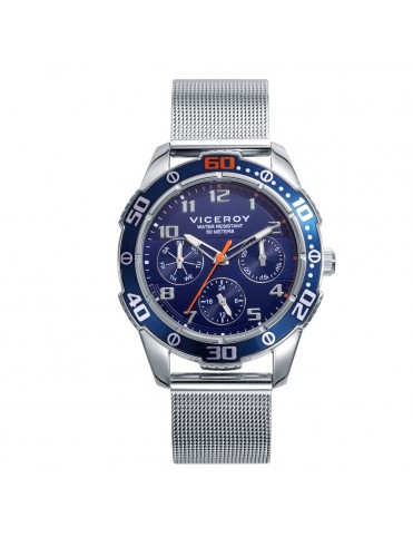 Pack Reloj Viceroy Niño Y Pulsera 401267-35, analógico multifunción. Caja y pulsera de acero. Bisel decorado en color azul. Esfera de 36mm de diámetro. Calendario mensual y semanal. Sumergible a 5ATM, por lo que es apto para ducha y baño sin inmersión. Acompañado de pulsera de piel y cruz de acero.