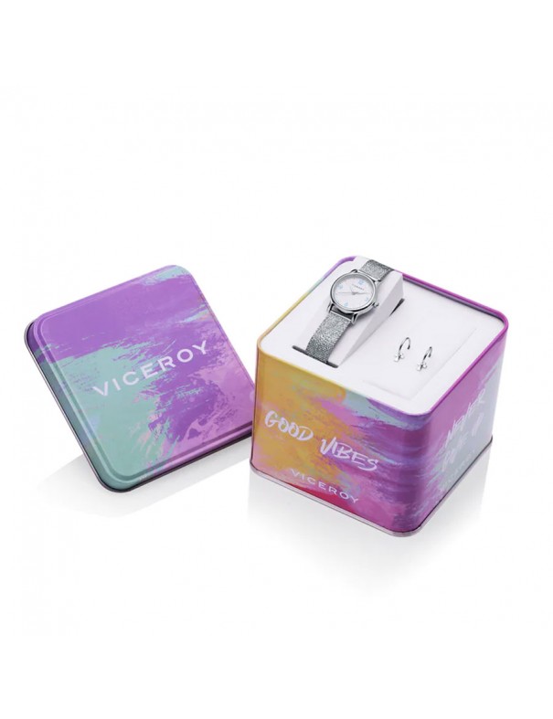 Reloj Viceroy para niña 41108-05. La pulsera es de malla de acero y lleva cierre deslizante ajustable. La esfera es del mismo material y mide 27 mm de diámetro. Incluye pendientes de plata de regalo. Es sumergible a 5 ATM y permite el nado en superficie sin inmersión. Garantía de tres años.