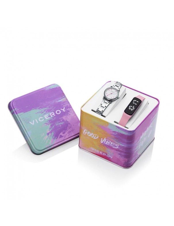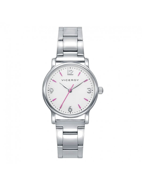 Reloj Viceroy para niña 41110-04. Le esfera es de acero y mide 27 mm de diámetro. La pulsera es del mismo material y lleva cierre de doble pulsador. Incluye pulsera de actividad de regalo. Es sumergible a 5 ATM y permite el nado en superficie sin inmersión. Garantía de tres años.