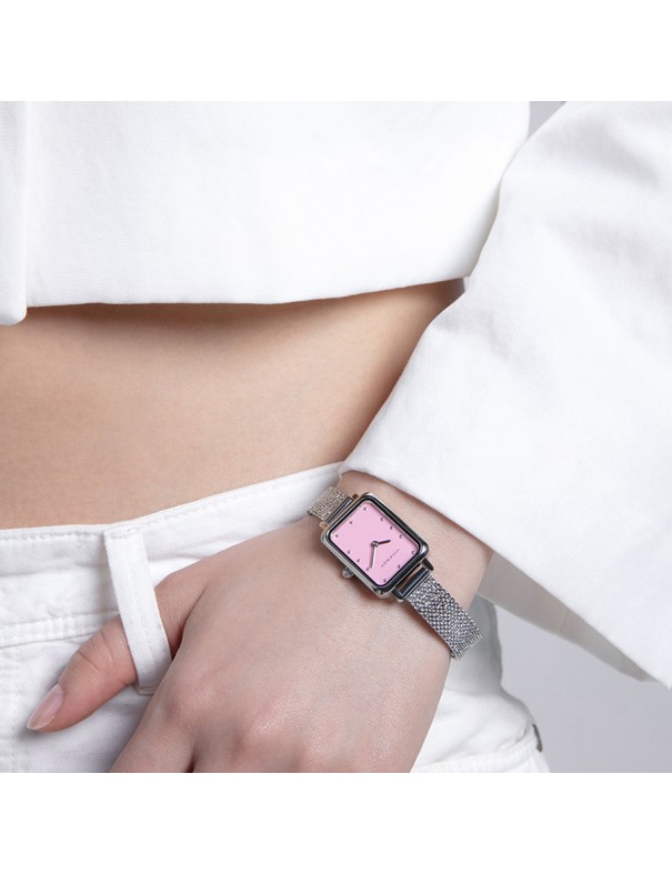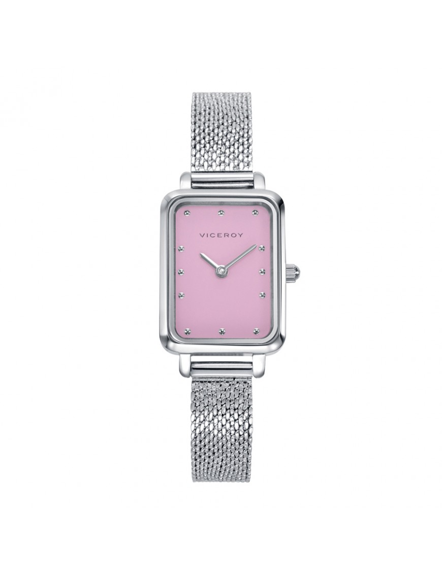 Reloj Viceroy Kiss para mujer 401218-77. La caja del reloj es de acero y mide 20 x 26 mm. La pulsera es de acero tipo malla milanesa con cierre deslizante ajustable. No es sumergible (3 ATM) y tiene tres años de garantía.
