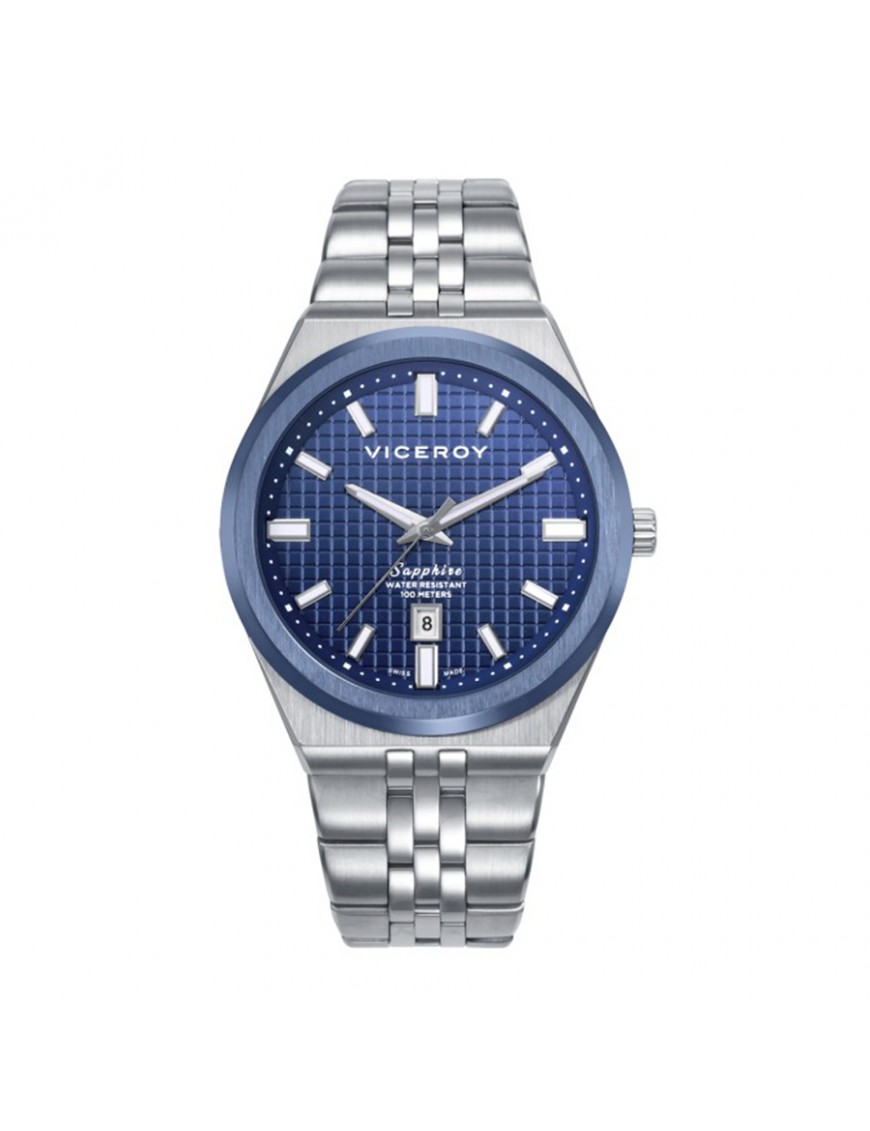Reloj Viceroy Swiss Made Plateado y Azul Hombre 45115-37. Caja de acero inoxidable de 41 mm de diámetro con bisel azul y esfera azul, correa de acero inoxidable plateada y azul con cierre desplegable mediante doble pulsador. Movimiento de cuarzo suizo con función de calendario y cristal de zafiro. Resistente al agua hasta 3 ATM.