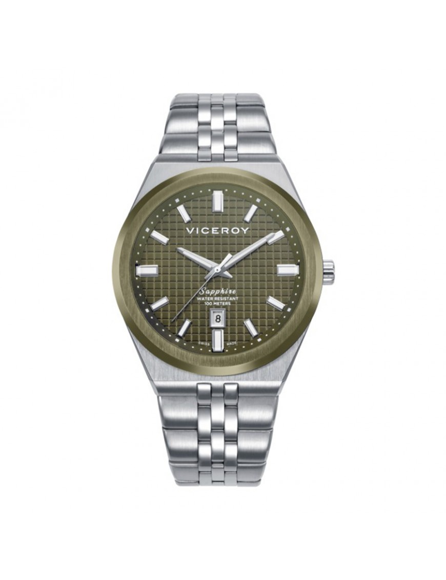 Reloj Viceroy Swiss Made Plateado y Verde Hombre 45115-67. Caja de acero inoxidable de 40 mm de diámetro en tono plata, con bisel plateado y esfera verde, cristal de zafiro. Correa de acero plateada con cierre desplegable de doble pulsador. Movimiento de cuarzo analógico suizo con función de calendario y resistencia al agua de 10 ATM.