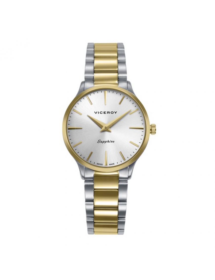 Reloj Viceroy Swiss Made Bicolor Mujer 45118-87. Caja de acero inoxidable de 32 mm con bisel dorado y esfera plateada bajo cristal de zafiro. Brazalete bicolor en acero plateado y dorado con cierre desplegable de doble pulsador. Movimiento de cuarzo analógico suizo. Resistente al agua hasta 5 ATM.