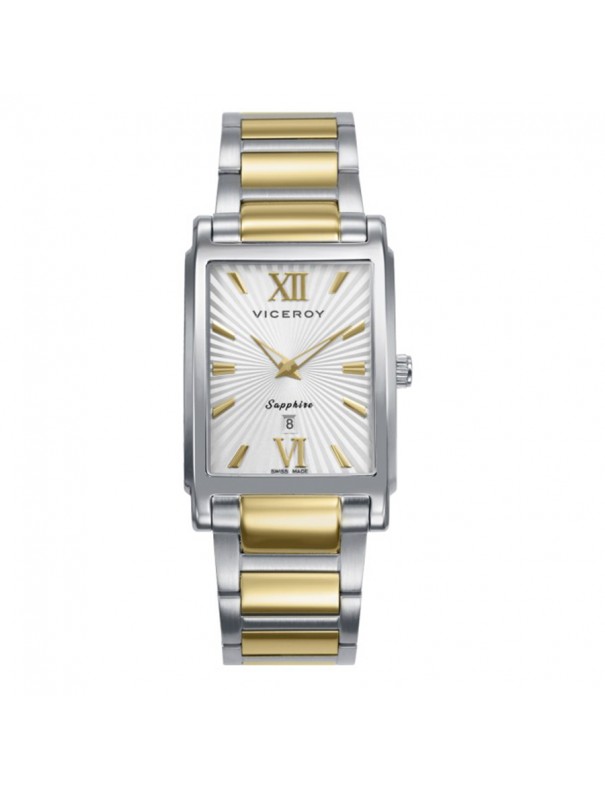 Reloj Viceroy Swiss Made Plateado y Dorado Hombre 45121-83. Caja rectangular de 46x30 mm en acero inoxidable plateado con bisel plateado y esfera plateada bajo cristal de zafiro. Brazalete bicolor en acero plateado y dorado con cierre desplegable de doble pulsador. Movimiento de cuarzo analógico suizo con función de calendario. Resistente al agua hasta 5 ATM.