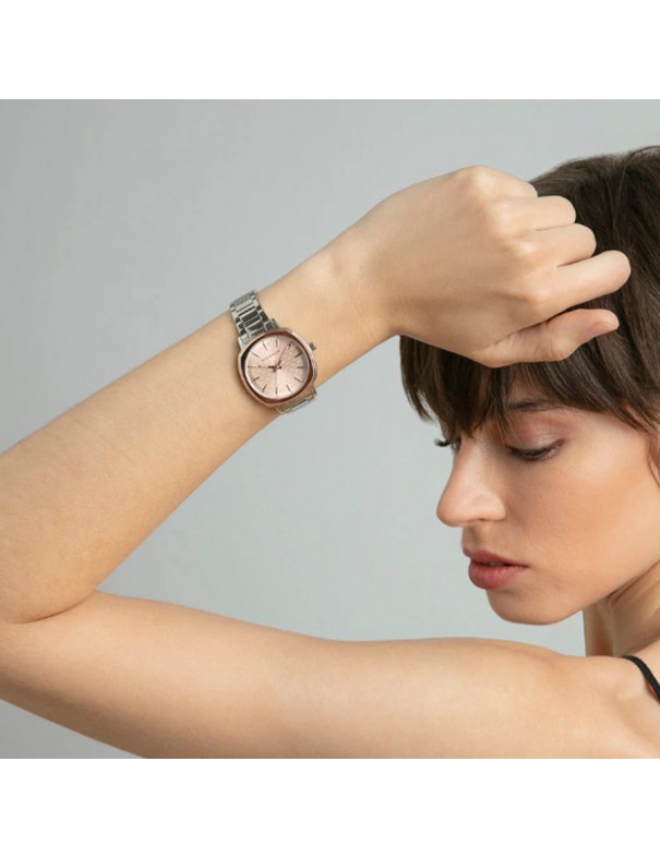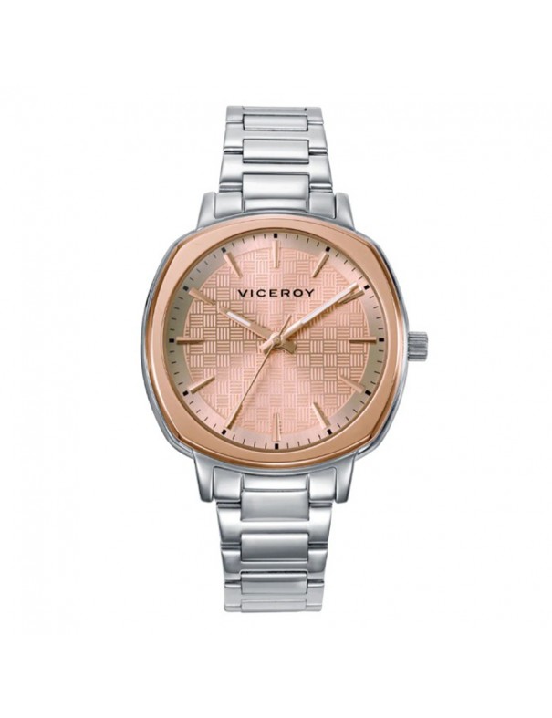 Reloj Viceroy Acero Esfera Rosa 401298-97. Caja de acero bitono en plateado y rosado y esfera rosa. Brazalete de acero inoxidable con cierre desplegable. Movimiento de cuarzo analógico de tres agujas. Sumergible hasta 5 ATM. Garantía de 3 años.
