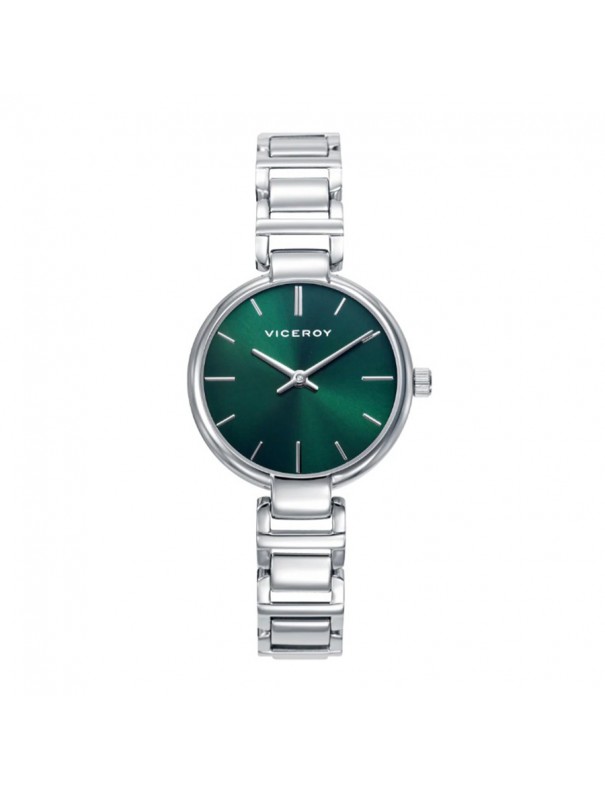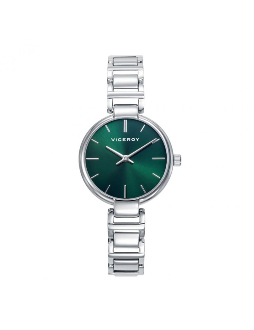 Reloj Viceroy Esfera Verde 401306-67. Reloj de mujer con caja y brazalete de acero inoxidable de color plateado. La esfera es verde con agujas e índices plateados, ofreciendo un estilo moderno y fresco. Cuenta con movimiento de cuarzo analógico, cristal mineral. Resistente al agua hasta 30m.