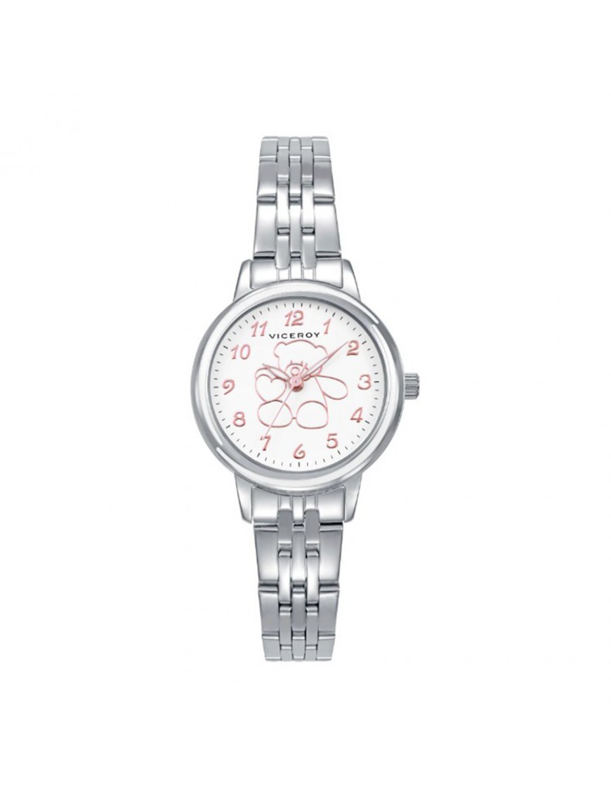 Reloj Viceroy Niña 401328-05. Reloj para niña con caja y brazalete de acero inoxidable, diseñado para ofrecer durabilidad y estilo sencillo. Su esfera blanca incluye diseño de un osito en color rosa. Fácil lectura y movimiento de cuarzo, práctico para uso diario y momentos especiales.