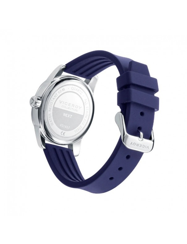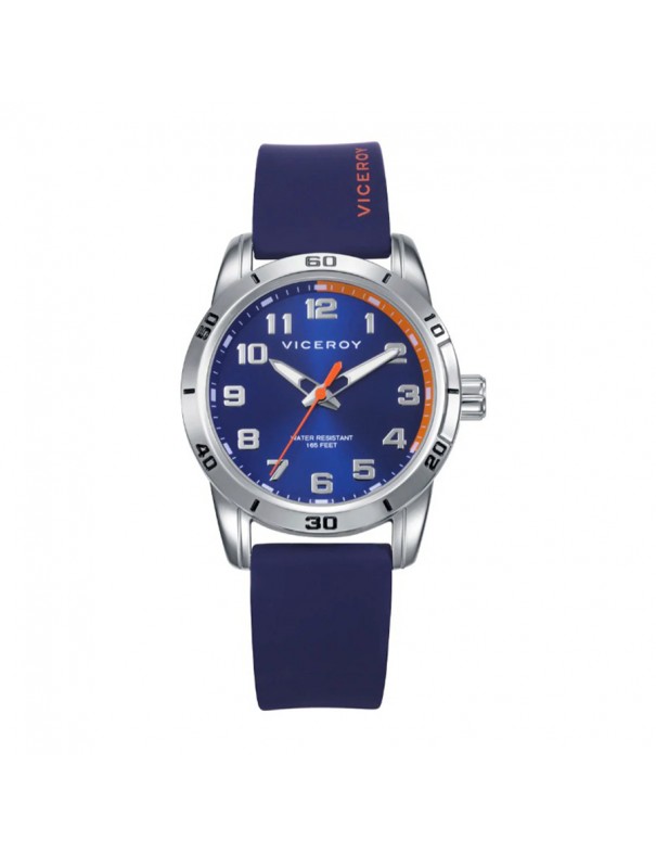 Reloj Viceroy Niño 401467-35. Cuenta con caja de acero inoxidable plateado y correa de silicona azul con esfera en tonos azul y naranja. Correa con cierre de hebilla y diseño deportivo infantil, incluye pulsera adicional de acero y piel azul. Funciones de hora con tres agujas y movimiento de cuarzo, además de cristal mineral. Resistencia al agua hasta 5 ATM. Garantía de 3 años.