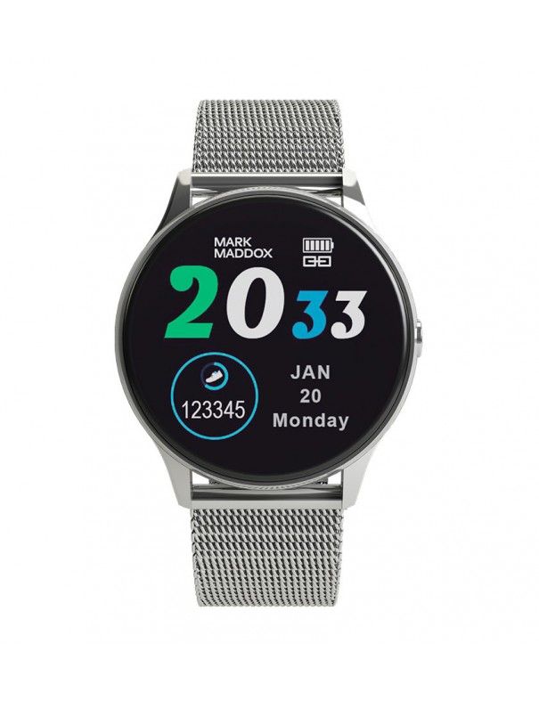 Smartwatch Mark Maddox Mujer MS1000-80, con correa milanesa de acero y correa de regalo de caucho blanco. Pantalla con resolución 240x240 y un diámetro de caja de 40mm. Entre sus funciones se encuentran: Notificación de llamadas y mensajes, Cronómetro, Monitorización del sueño, Alarma, Estado del tiempo, Localizador del teléfono, Control de cámara remota, Cuenta calorías, Distancia recorrida, Medición de oxígeno en sangre y presión arterial, diferentes modos de deporte. Resistencia al agua IP68, por lo que no le entrará líquido sumergido a un metro y medio durante media hora. Con garantía de dos años contra defectos de fabricación.