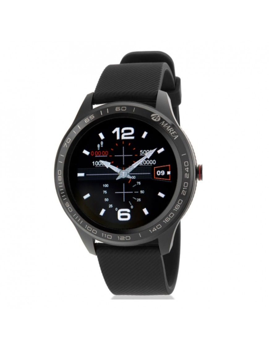 Marea Smart B60001/1, pantalla de 1,39 pulgadas y pulsera de caucho negro. Caja de plástico con un tamaño de 47mm. Batería de 300mAh. Entre sus funciones se encuentran: Monitorización del sueño, Cuenta pasos, Distancia Recorrida, Calorías consumidas, Medición de saturación de oxígeno en sangre, Presión arterial, Control Remoto de música y cámara, Alarma, Cronómetro ... Impermeabilidad de IP68, por lo que puede ser sumergido en agua hasta un metro y medio durante media hora. Garantía de dos años contra defectos de fabricación.