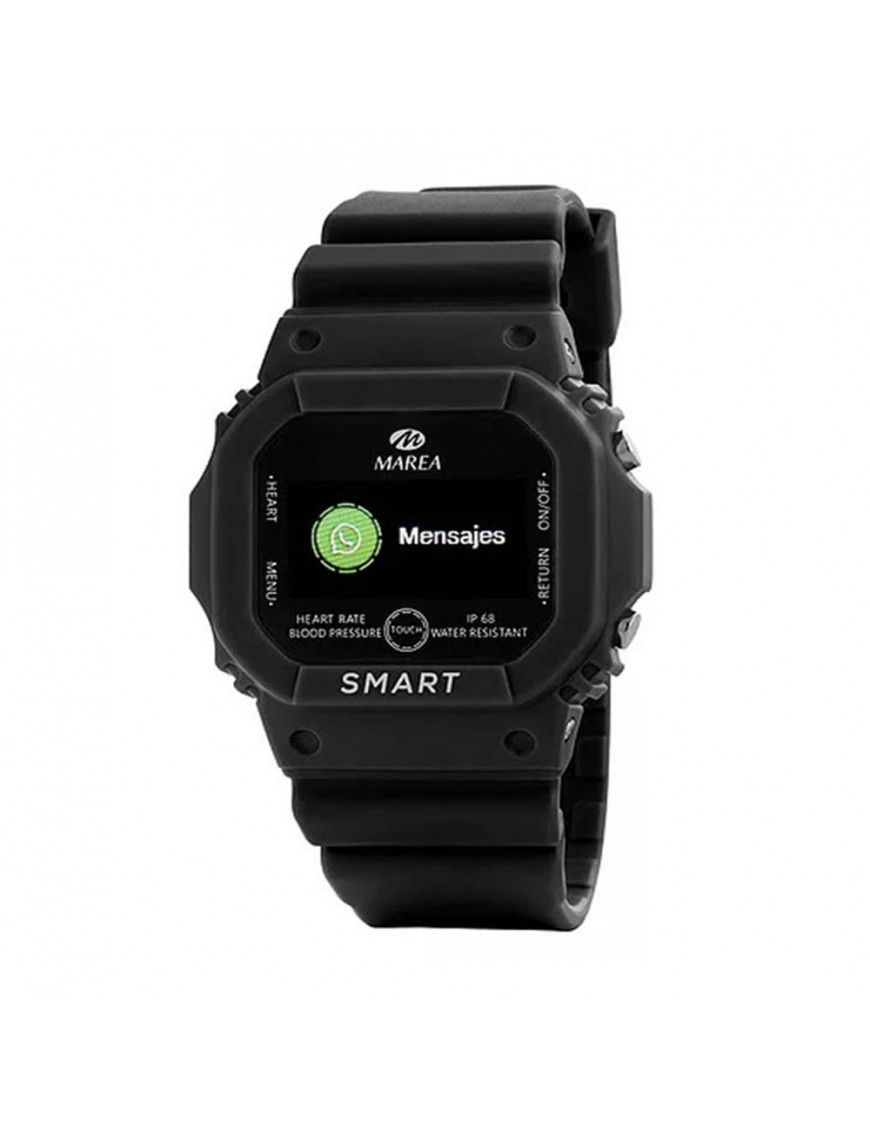 Marea Smart Unisex B60002/1, pantalla de 0,96 pulgadas , caja de plástico de 43X47mm y pulsera de caucho negro. Múltiples funciones como alarma, distancia recorrida, calorías consumidas, pasos, monitorización del sueño, frecuencia cardíaca, prueba automática de FC, presión sanguínea, oxígeno en sangre,notificación de llamadas, mensajes y redes sociales. Batería de 200mAh. Protección IP68, garantiza la protección en agua hasta 1,5 metros de profundidad durante media hora.