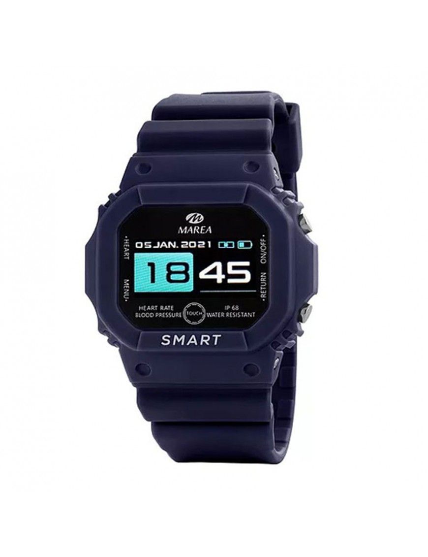 Marea Smart Unisex B60002/2, pantalla de 0,96 pulgadas , caja de plástico de 43X47mm y pulsera azul marino. Múltiples funciones como alarma, distancia recorrida, calorías consumidas, pasos, monitorización del sueño, frecuencia cardíaca, prueba automática de FC, presión sanguínea, oxígeno en sangre,notificación de llamadas, mensajes y redes sociales. Batería de 200mAh. Protección IP68, garantiza la protección en agua hasta 1,5 metros de profundidad durante media hora.