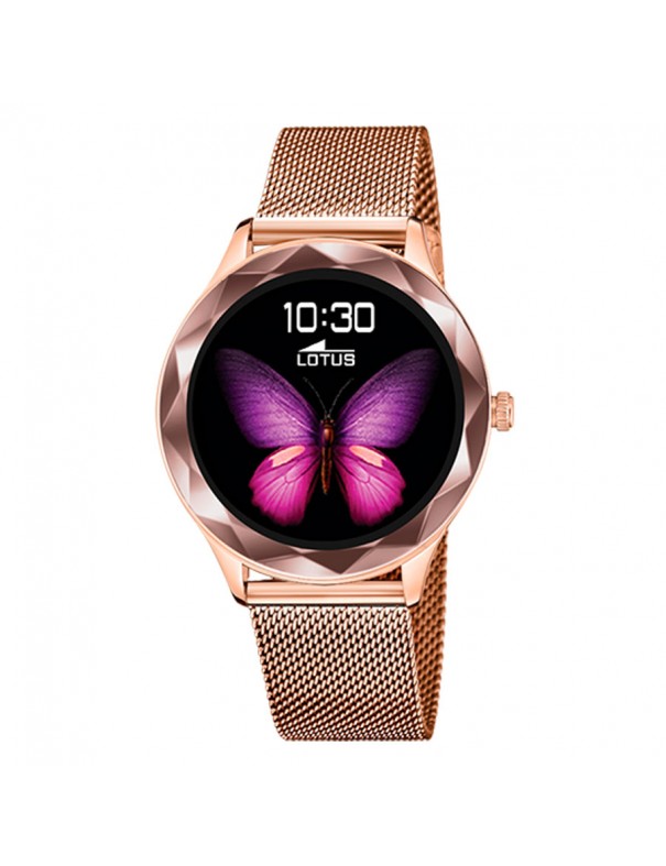 Reloj Lotus Smart para mujer 50036/1. La esfera mide 38 mm de diámetro. La pulsera de malla es de acero rosado ajustable. Incluye funciones smart como pulsómetro, medición de presión arterial, cuenta pasos, cuenta calorías, notificaciones y funciones deportivas entre otras.
